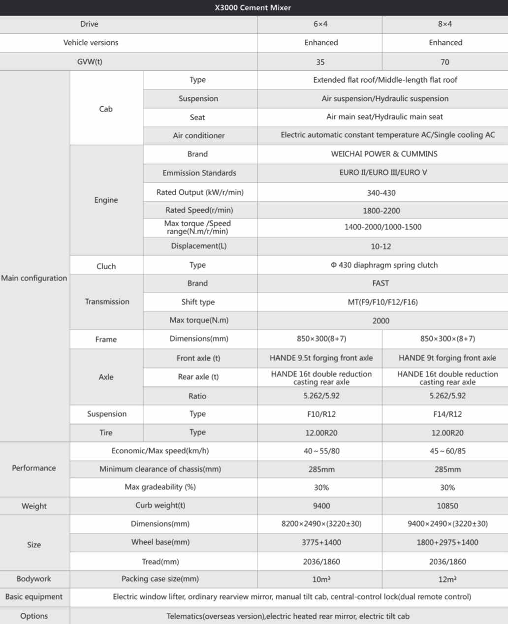 El chasis está equipado con motores Wuxi Chaiwei WP10/WP12, con una potencia máxima que varía de 350 a 460 caballos de fuerza. Se combina con la transmisión de 12 velocidades FATAI y el eje técnico Hande Man, adecuado para condiciones complejas del sitio de construcción. La cabina adopta un diseño de suspensión de cuatro puntos y está equipado con asientos que absorben el choque de airbag, lo que mejora significativamente la comodidad del conductor. La superficie del tanque se somete a un tratamiento con plancha de arena anticorrosión, y se puede instalar un sistema de pulverización opcional para evitar que el concreto se adhiera. La rampa de descarga trasera puede girar 270 grados, y la palanca de operaciones está dispuesta en el lado derecho del vehículo, facilitando el control preciso de una sola persona. Todo el vehículo cumple con los estándares nacionales de emisiones VI y es una solución de transporte de concreto eficiente y ecológica para proyectos de construcción urbana.